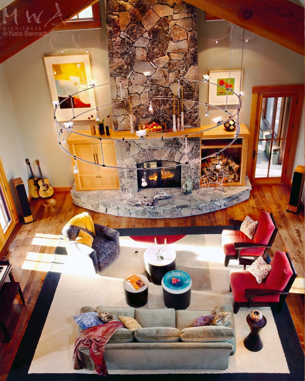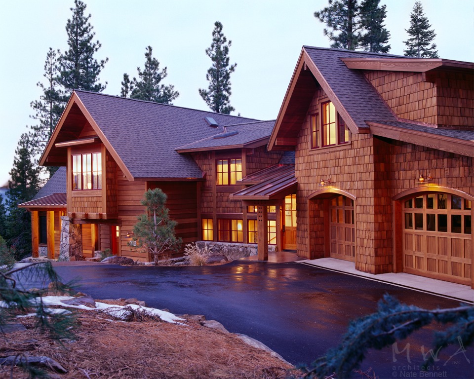 The exterior is redwood and the interior wood was chosen to be douglas fir as Pacific Rim regionally appropriate. The great room includes large picture windows framing views of the Martis Valley, a large granite fireplace, and is spanned by two large timber scissor trusses supporting a ridge cupola.
