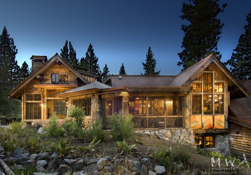 Truckee Architect Kurt Reinken's assisted the Bay Area client in selecting the home site in the middle of a blizzard on snowshoes. The unique cross slope and rock outcrops are embraced by an entry courtyard. The theme was for a timeless and low maintenance Lake Tahoe style family lodge. The siding is a mix of reclaimed skip sheathing from a tobacco drying barn in the Carolinas and rusted Corten steel. The goal was for an informal vacation experience. Three suites and a bunk room are pulled apart to the far ends of the home offering maximum privacy. The owners' favorite space is the breakfast nook that is stone inside and out with southern windows looking towards Look Out Mountain. Hydronic heat has been run behind the stone so that the space is warm during the frigid Truckee winter mornings.