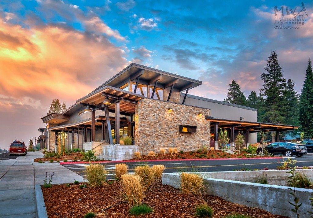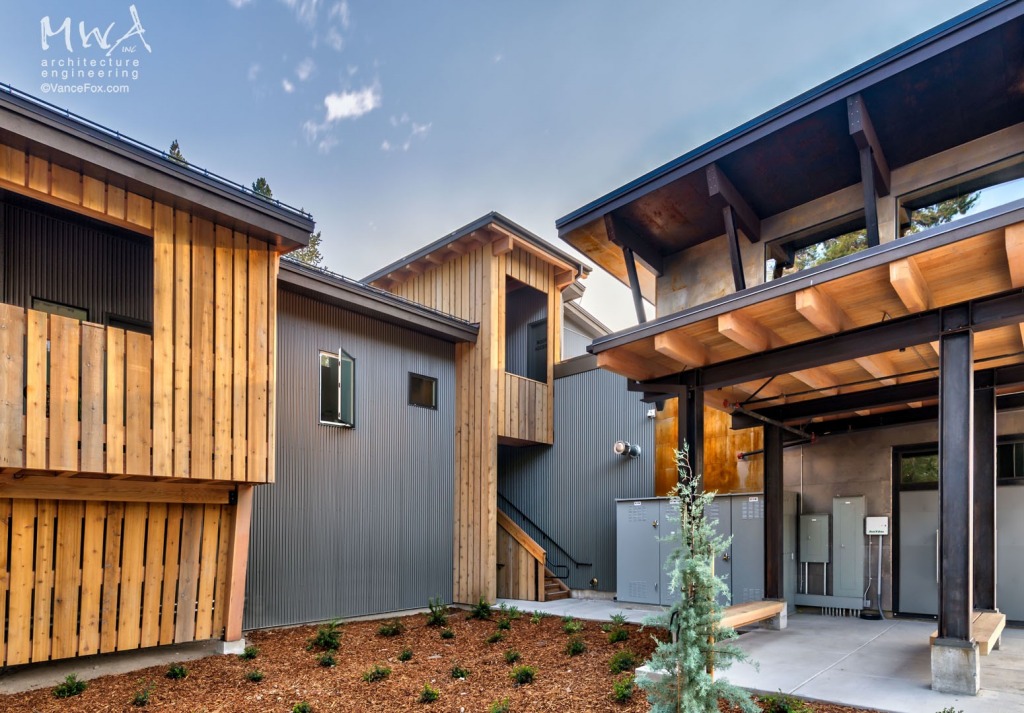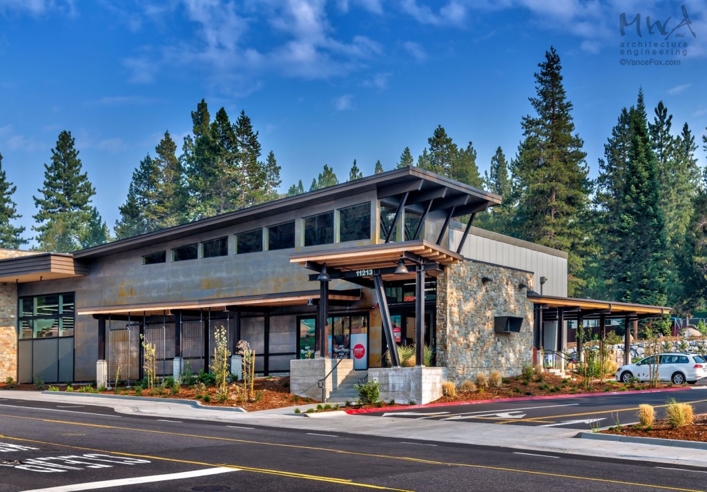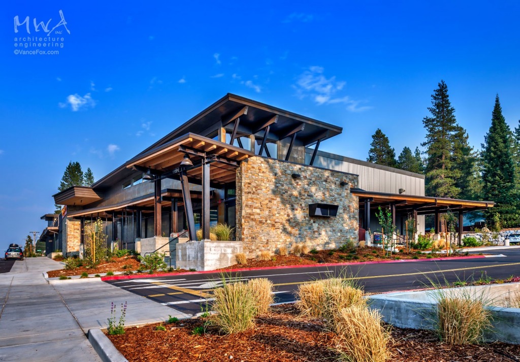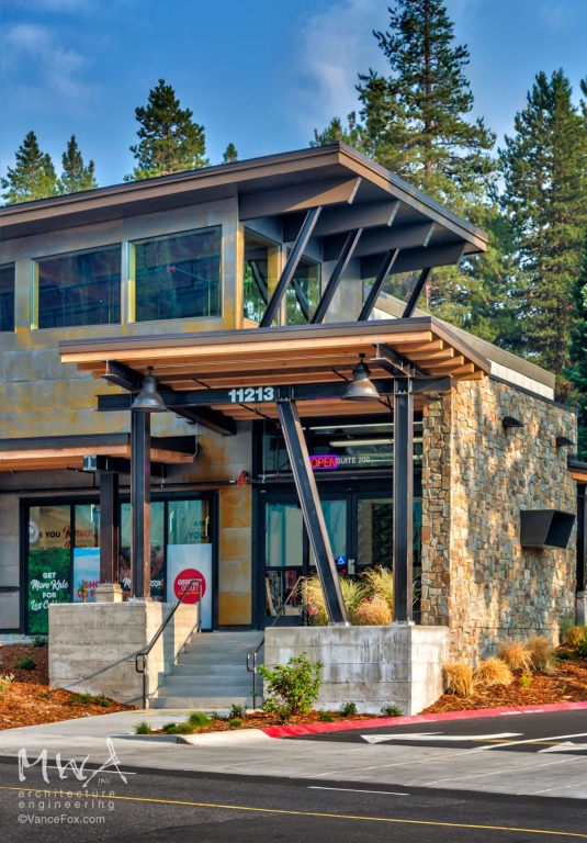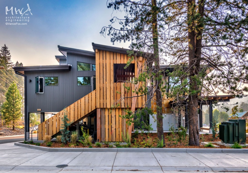 This building not only offers a commercial space but also includes a residential element that provides 3 new housing units in the heart of Truckee. Benches at various locations allow people of the community to stop, rest and gather allowing for a function beyond what is housed within the building. The many rooflines, forms, and exterior materials invite people to take a look and experience what is possible with innovative and thoughtful commercial design that is not just a box.