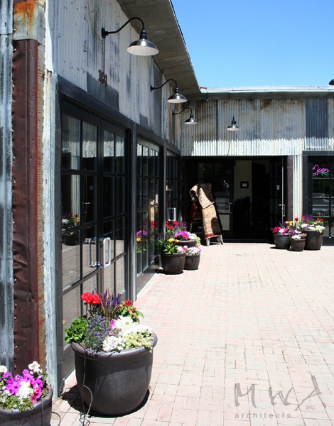 The successful, award-winning adaptive reuse of transforming a garage into office and retail space. The building incorporates the original corrugated galvanized metal for siding and the structure’s original dimensions, even down to the pitch of the roof.