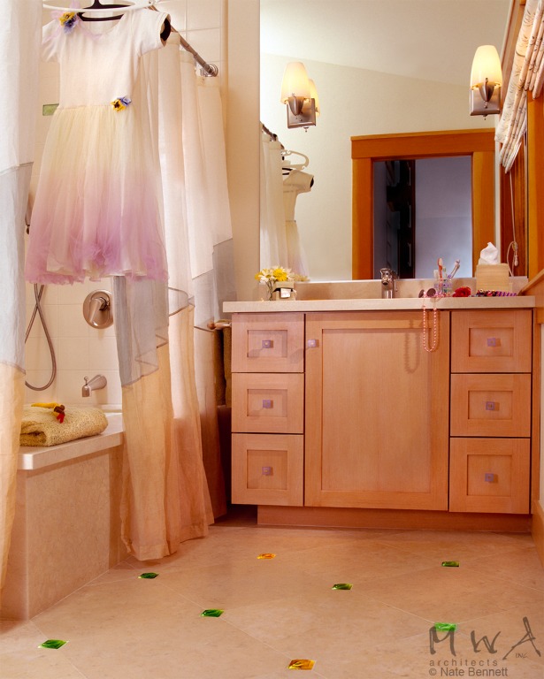 The young daughter's bathroom has a discreet feature of fiber-optically lit glass floor tiles that serve as night lights.