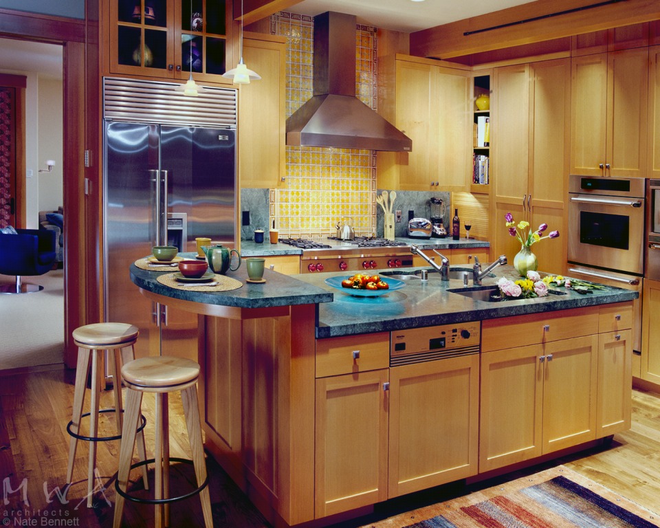 A unique highlight of the kitchen is island with dual facing sinks that make the task of washing dishes a social experience.