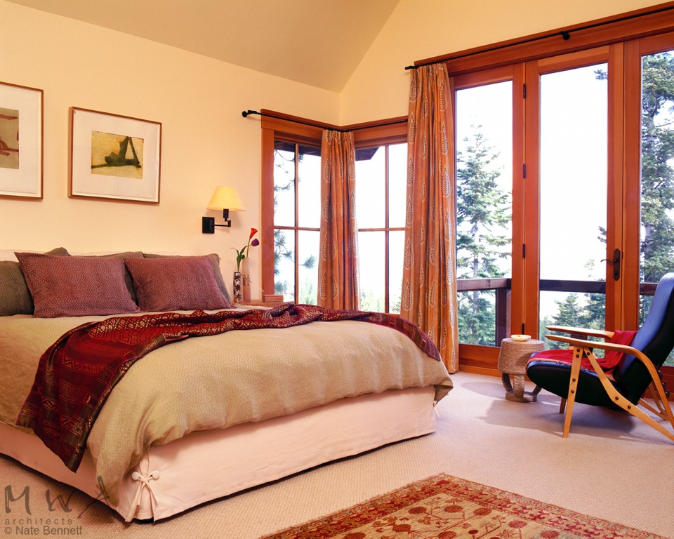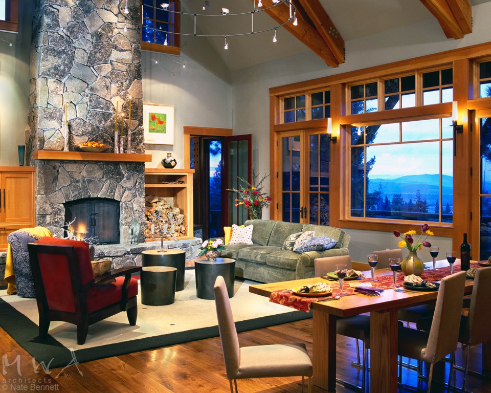 The exterior is redwood and the interior wood was chosen to be douglas fir as Pacific Rim regionally appropriate. The great room includes large picture windows framing views of the Martis Valley, a large granite fireplace, and is spanned by two large timber scissor trusses supporting a ridge cupola.