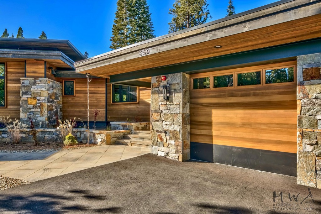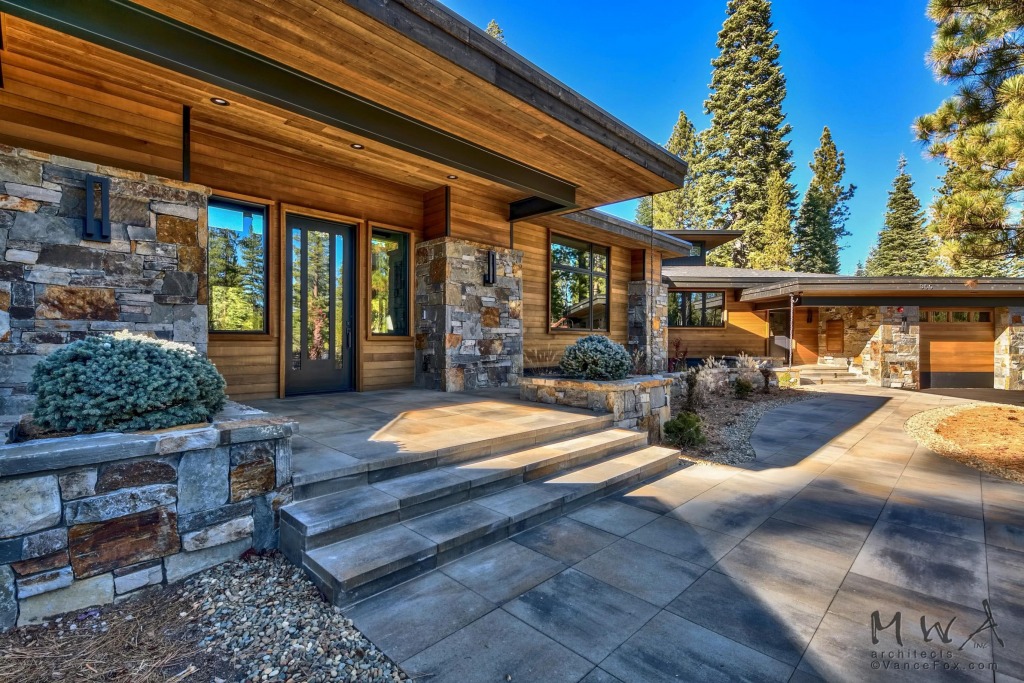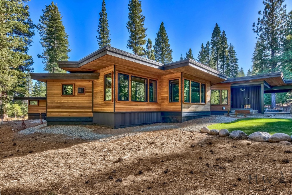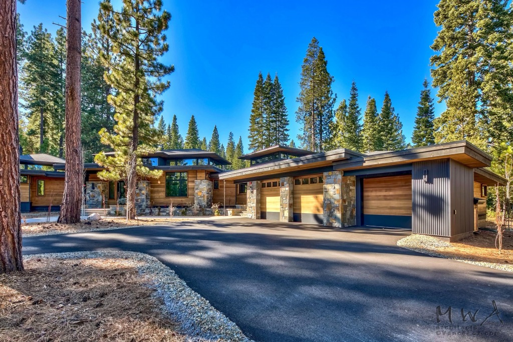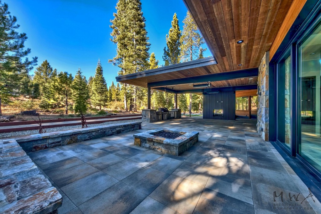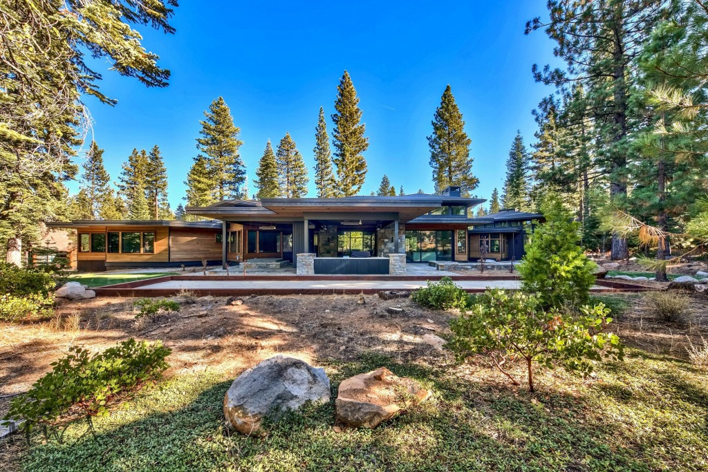 Mountain modern on a secluded Lahontan property, this home features a generous outdoor living area with a fire place, built-in BBQ, a fire pit patio, and a bocce court!