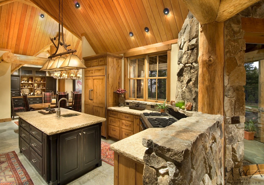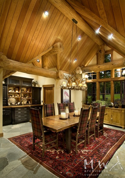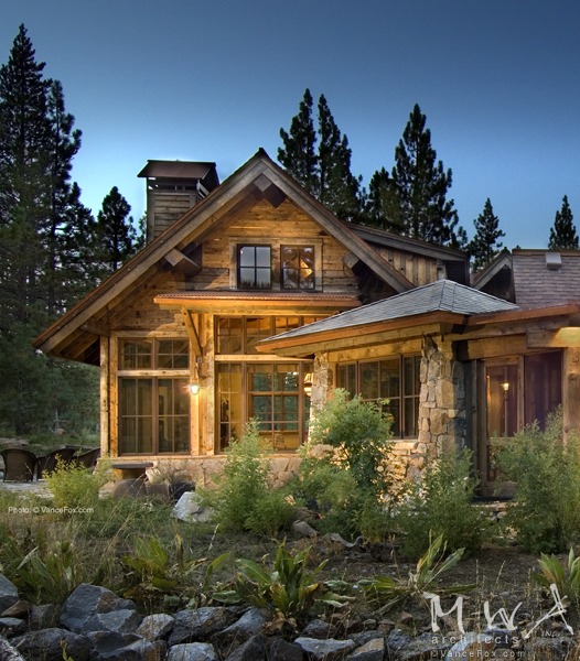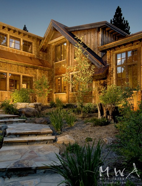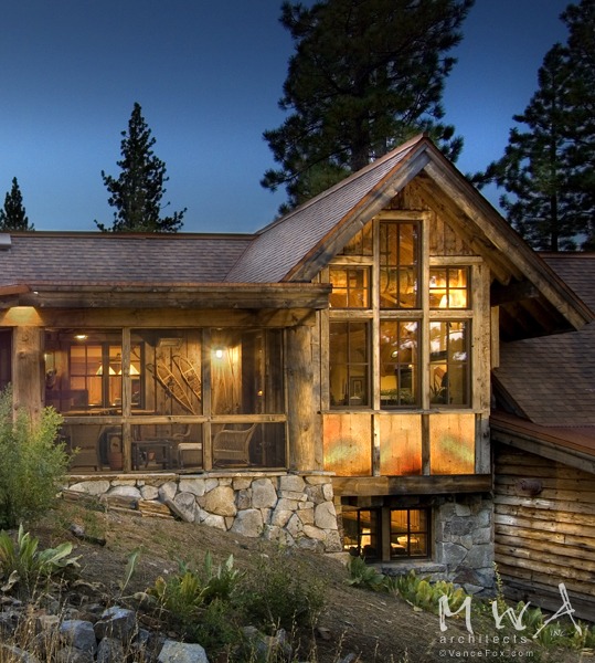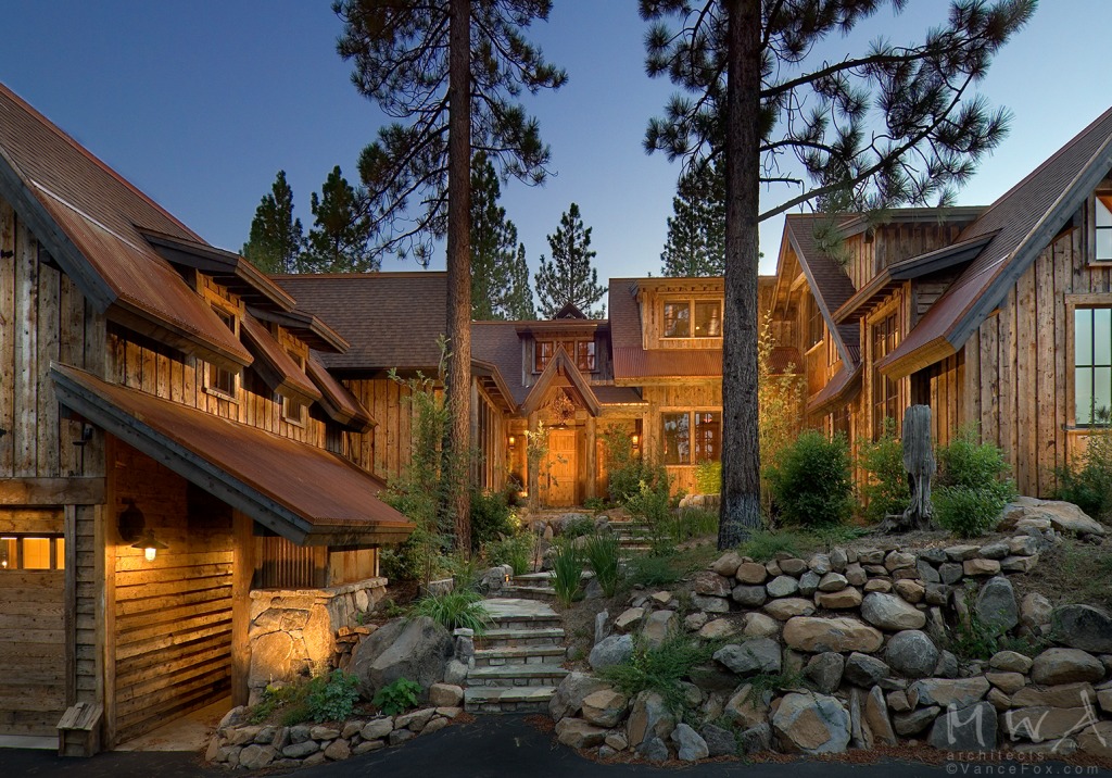 Truckee Architect Kurt Reinken's assisted the Bay Area client in selecting the home site in the middle of a blizzard on snowshoes. The unique cross slope and rock outcrops are embraced by an entry courtyard. The theme was for a timeless and low maintenance Lake Tahoe style family lodge. The siding is a mix of reclaimed skip sheathing from a tobacco drying barn in the Carolinas and rusted Corten steel. The goal was for an informal vacation experience. Three suites and a bunk room are pulled apart to the far ends of the home offering maximum privacy. The owners' favorite space is the breakfast nook that is stone inside and out with southern windows looking towards Look Out Mountain. Hydronic heat has been run behind the stone so that the space is warm during the frigid Truckee winter mornings.