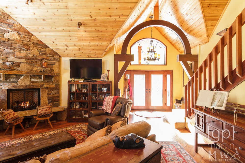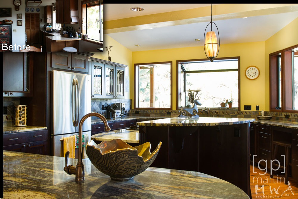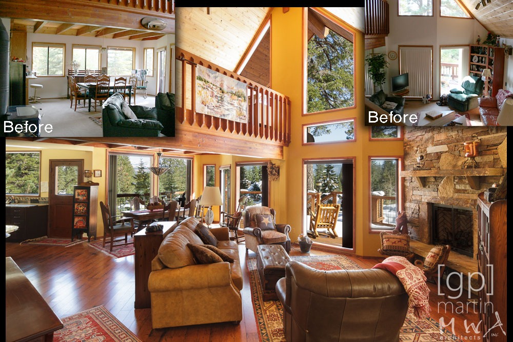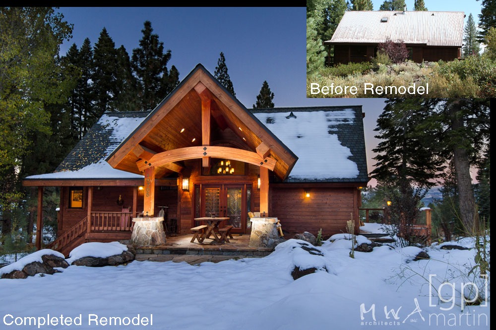 A dramatic transformation and modernization of 25-year-old vacation home. An entry gable roof form was added, along with a substantial addition, allowing a significant upgrade to the kitchen and additional living space downstairs.